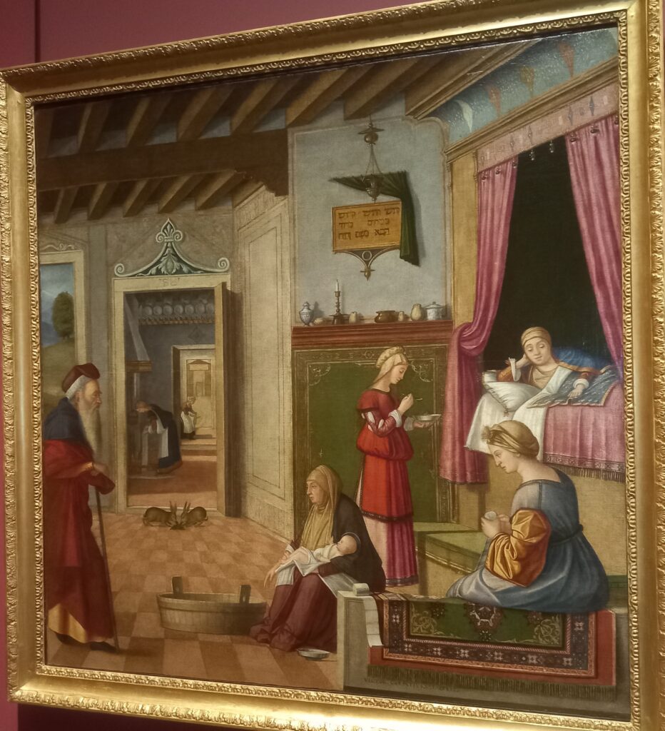 Questo dipinto fa parte di un ciclo con storie di Maria, realizzato per la Scuola degli Albanesi di Venezia. Sant’Anna, madre della Vergine, si riposa dopo il parto, assistita da donne: una le porta un piatto per rifocillarla; un’altra, elegantemente seduta su un parapetto ricoperto da un tappeto orientale, sta arrotolando le fasce. La levatrice prepara il bagno per la neonata aureolata che tiene sulle ginocchia; l’anziano marito, Gioacchino, guarda la scena in disparte.