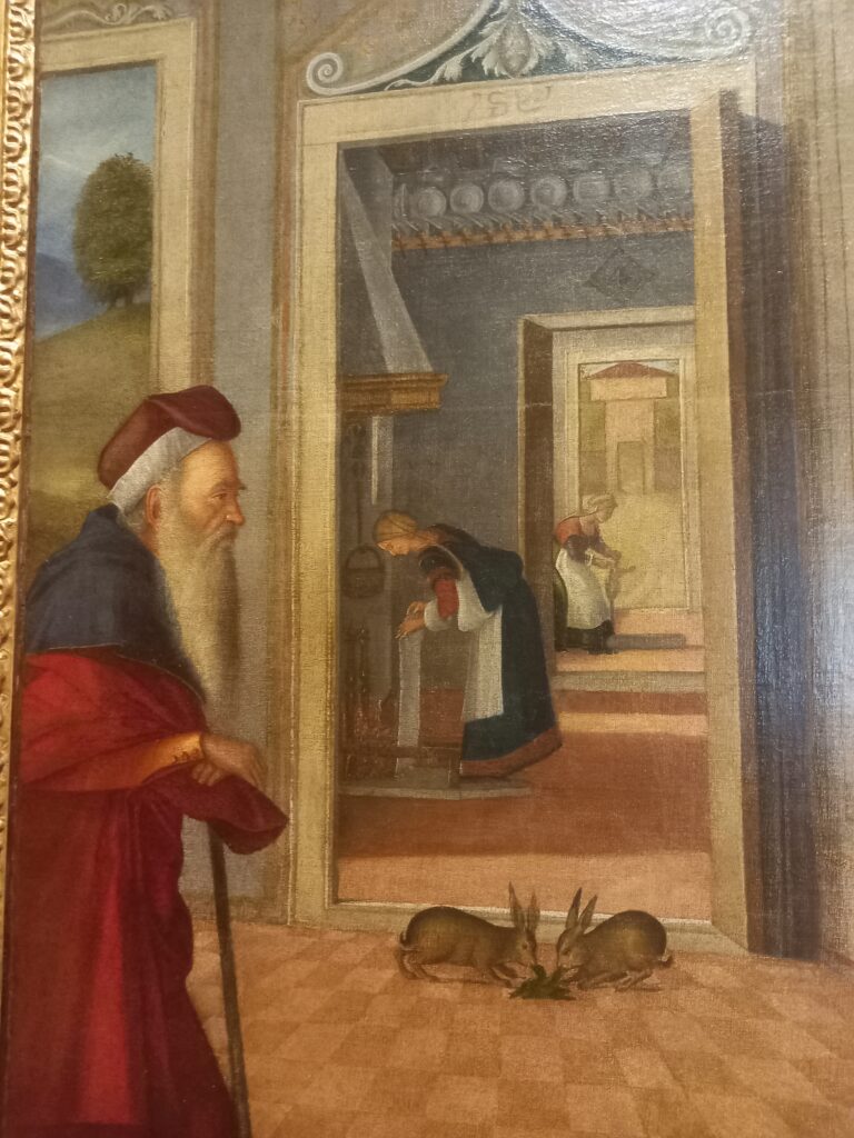 Il racconto è arricchito da episodi in apparenza secondari, ma fortemente simbolici: i conigli che rosicchiano una foglia di cavolo alludono alla verginità di Maria; l’invocazione (“Santo Santo Santo nel Cielo benedetto Colui che viene nel Nome del Signore”), scritta in caratteri ebraici, della targa appesa alla parete, richiama il nome di Cristo. Da notare la tenda verde che, in genere, copre la scrittura e che, invece, è stata tirata da parte.