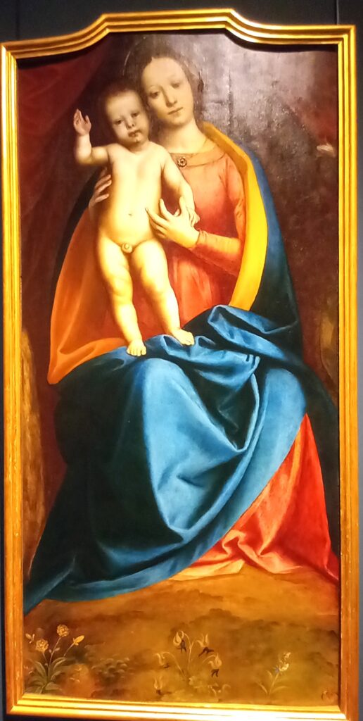 Sullo sfondo terroso, spiccano i colori vivaci e luminosi dell’opera, giocata sul rosso, sul giallo e sul blu. La Madonna è maestosa, con la figura allungata, i capelli raccolti e una piccola spilla a fermare il velo sulla veste. Tiene sulle ginocchia il Bambino benedicente, in piedi e nudo, senza nessun simbolo evidente che ne anticipi la Passione – a meno di interpretare, in tal senso, i grappoli di fiori stilizzati sul terreno; di essi, riconosco solo i garofani, legati alla passione di Cristo e all’amore materno della Vergine (secondo la tradizione, i primi garofani nacquero dalle lacrime della Madonna durante la Crocifissione).