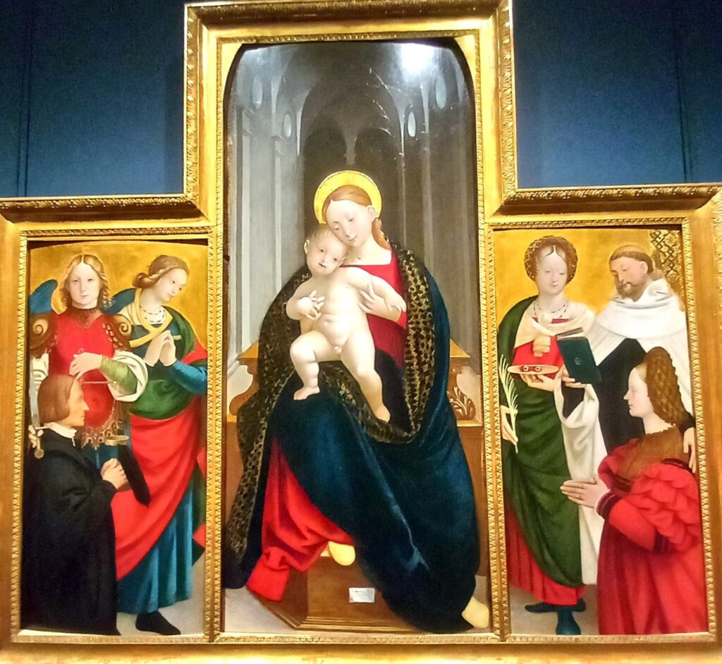 Gli scomparti laterali mi ricordano i polittici fiamminghi in cui, generalmente, due santi presentano alla Vergine, dello scomparto centrale, i devoti committenti con o senza la famiglia. Il primo che ricordo è il Trittico Portinari di Hugo van der Goes, agli Uffizi.