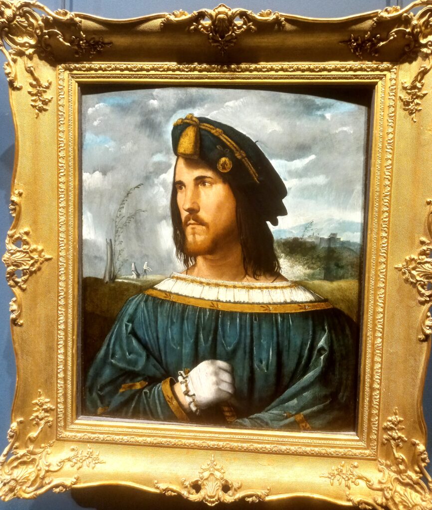 A lungo si è creduto che questo famosissimo dipinto ritraesse Cesare Borgia, il Valentino. Ma la tesi è stata negata. Vi è raffigurato un gentiluomo dallo sguardo fiero: è il suo fascino quello sguardo penetrante verso un orizzonte sconosciuto o forse un trascorso burrascoso. Questa potrebbe essere l’interpretazione del paesaggio temporalesco – attraversato da due misteriose figure.