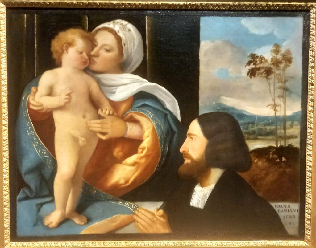 Rifacendosi allo schema belliniano, il pittore dipinge il committente inginocchiato nella parte inferiore. Ma inserisce anche qualcosa di nuovo (o di antico, se pensiamo al Mantegna della Madonna col Bambino, qui alla Carrara): il tenero gesto della Vergine che appoggia la guancia a quella di Gesù, e il manto che si gonfia – elegantemente – nel vento divino. Del resto, Cariani, esegue il dipinto dopo il suo ritorno a Bergamo, quando entra in contatto con le invenzioni di Lorenzo Lotto, che rivoluzionò la pittura locale.