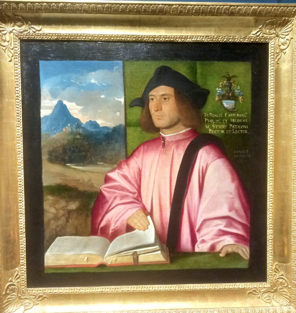 È il caso di questo dipinto: i dettagli realistici del volto e delle mani si inseriscono in un ritratto impostato alla maniera veneziana. Chi sia questo personaggio lo leggiamo nell’iscrizione riportata sulla tenda alle sue spalle: Giovanni Benedetto Caravaggi, laureato all’Università di Padova in medicina e filosofia. Il gentiluomo, figlio del docente di grammatica Francesco Caravaggi, viene presentato nella veste di erudito, mentre sfoglia un corposo manoscritto, dal quale spunta un elegante segnalibro in pelle. L’educazione veneziana del Cariani emerge anche dal paesaggio bagnato dalla luce rosata del tramonto e dall’uso di colori caldi e dorati.