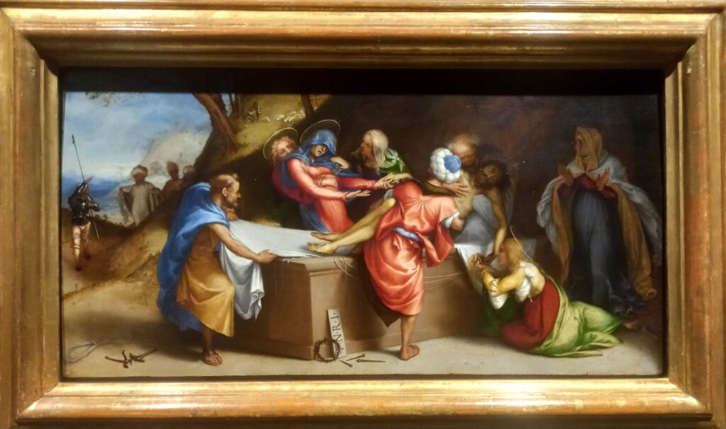 È una scena drammatica, descritta con dovizia di particolari. Cristo ormai deposto dalla croce, viene calato nel sepolcro. In primo piano, sono appoggiati gli strumenti del martirio.