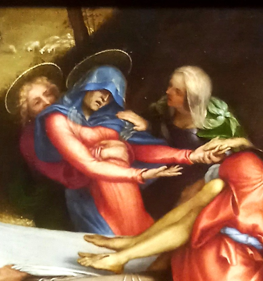 In primo piano, a destra, Maria Maddalena prostrata che, con i capelli, accarezza l’altra mano abbandonata del Cristo; i suoi abiti sono colorati: sotto la veste rossa, compare il bustino giallo e gli sbuffi di ampie maniche bianche.