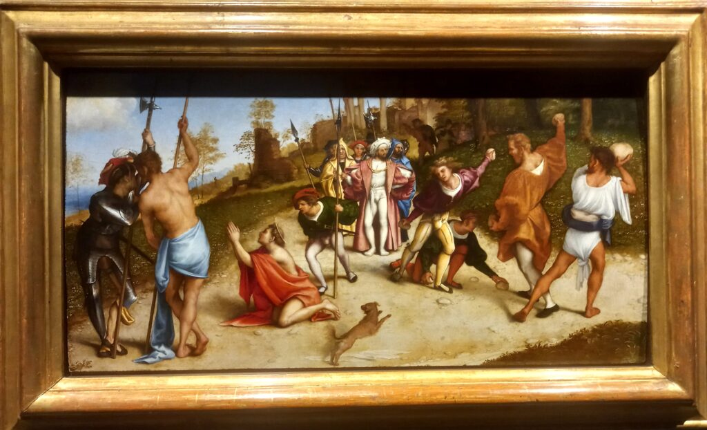 A destra della tela, tre grandi personaggi nell’atto della lapidazione; al centro sono raffigurati uomini in arme, di fogge diverse. Perché, in quel periodo, Bergamo era invasa da più eserciti: francesi, viscontei e veneziani. Quindi il quadro voleva rappresentare anche il martirio subito dalla popolazione orobica ad opera dei tanti soldati stranieri.