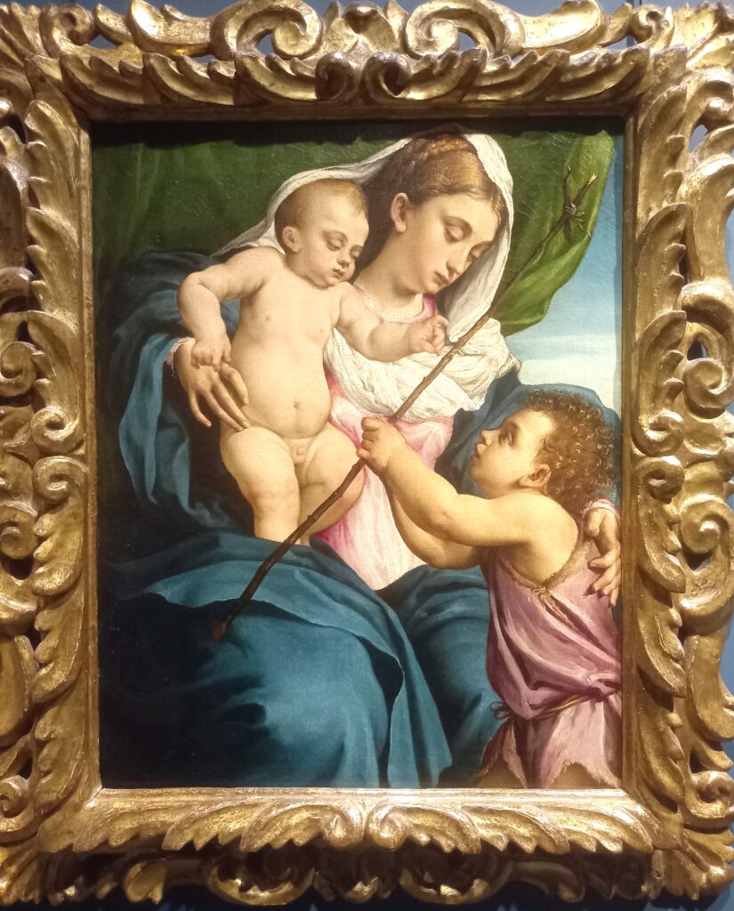 È un dipinto giovanile di Jacopo Bassano, ma ha già tutte le caratteristiche che rendono l’artista riconoscibile e inimitabile. La Vergine stringe in un abbraccio entrambi i bambini (Gesù e Giovannino), formando un compatto gruppo monumentale che occupa gran parte dello spazio. La compattezza, in realtà, viene rotta dalla rozza croce astile di Giovannino che separa il bambino dalla coppia divina. Il gioco degli occhi e delle mani è incredibile: la Madonna è chiusa in una espressione triste e mesta, ma la sua mano è appoggiata teneramente sulla schiena del piccolo, innocente profeta, così come i suoi occhi che lo perdonano. Giovannino porge il bastoncino a Gesù, quasi per giocare. Il Bambino è titubante e diffidente: con una mano si aggrappa alla mano della madre, mentre allunga l’indice dell’altra per tastare quello strano oggetto del cugino.
