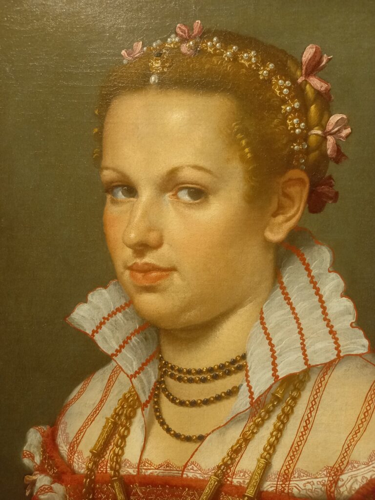 Il taglio del ritratto e l’impostazione di tre quarti della testa, il realismo conciso e diretto del modello, i particolari descritti minuziosamente dell’acconciatura con i gioielli fra i capelli, i ricami a filo d’oro della camora in velluto, l’abito con il colletto alla veneziana, la ricchezza delle grosse collane d’oro, le trasparenze della parte in pizzo, le lumeggiature del vestito e l’incarnato rosa acceso del volto, fanno datare la tela intorno agli anni ’40 del ‘500.