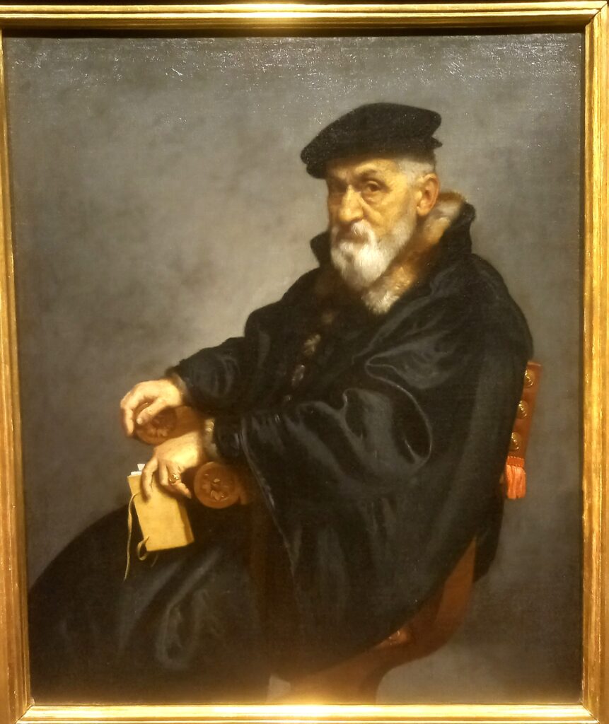 La sopravveste foderata di pelliccia con le grandi maniche cascanti, la lunga barba bianca ben curata, e il cappello nero, ci raccontano di un uomo colto e di potere.