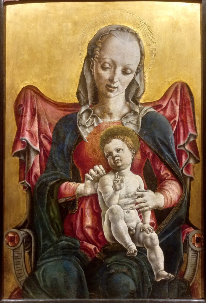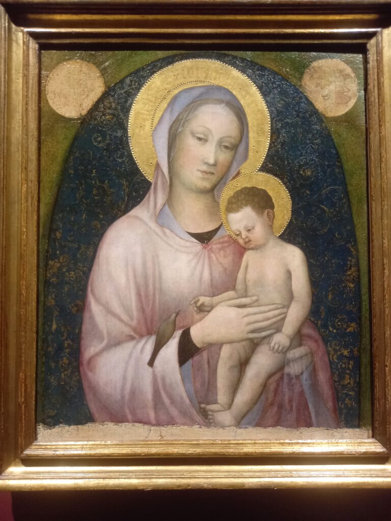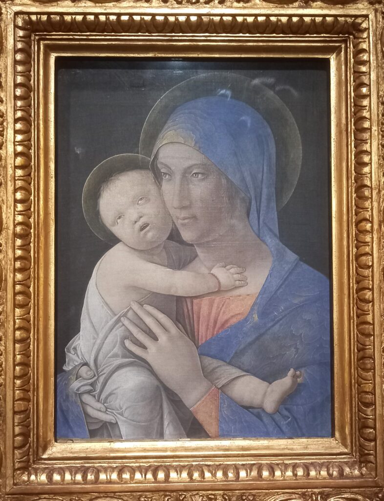 Jacopo Bellini, padre di Giovanni e Gentile Bellini, è considerato il patriarca della pittura veneziana. Si è formato nello stile tardo-gotico con Gentile da Fabriano, ma guardando alle novità del Rinascimento toscano. Questo dipinto è figlio di questa duplice influenza. L’arte gotica sta nella severa impostazione frontale e nella delicatezza dei dettagli – le aureole dorate e punzonate, ad esempio. Rinascimentali sono la naturalezza delle espressioni e dei sentimenti, e il chiaroscuro che modella le forme. Maria e Gesù sono colti in un momento di tenera quotidianità: un usignolo si è appoggiato sul braccio di Maria e Gesù si china a guardarlo, incuriosito. Il canto dell’usignolo è metafora del messaggio cristiano.