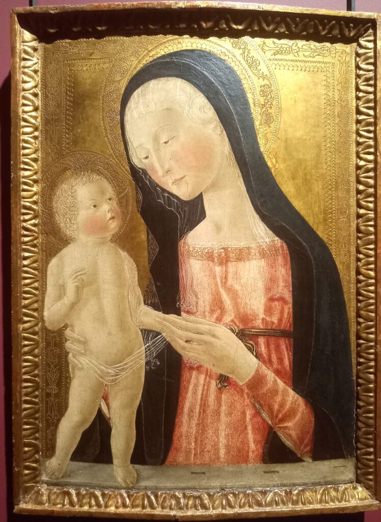 Una delle pitture più raffinate e delicate della pinacoteca. Lo stile è quello della tradizione gotica senese per lo sfondo oro e per la posizione del Bambino e della Madonna; eppure questo non è un dipinto gotico. La figura di Gesù si rifà a Donatello; così come i dettagli realistici delle staffe che fissano il davanzale alla finestra.
