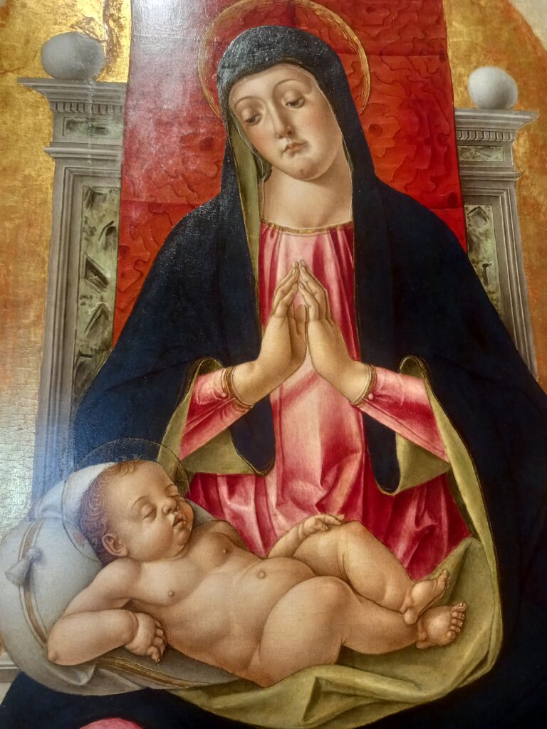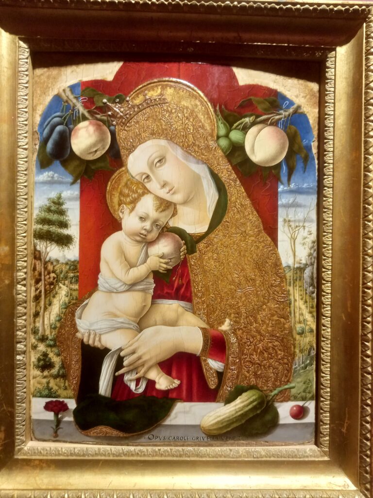 Adoro Crivelli: il suo horror vacui è il mio, le sue Madonne e i suoi Bambini sono bellissimi, con quei ricci delineati a uno a uno, la delicatezza dell’incarnato, l’aria soave dei volti; ma anche – in altre opere – i volti sfigurati deturpati dal dolore, i gesti rattrappiti e – spesso, nei personaggi secondari – una vena ironica, quasi grottesca.