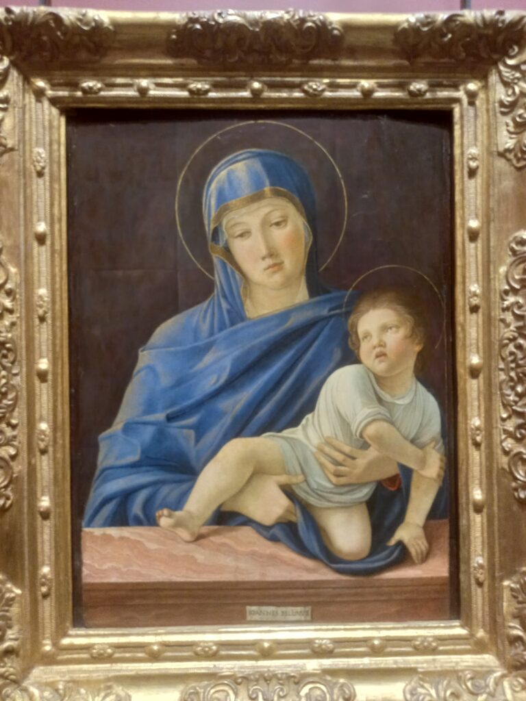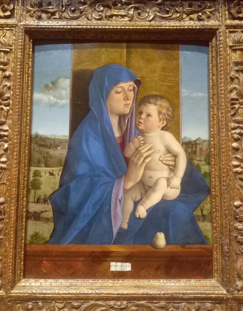 Berenson considerava questo quadro “uno dei più bei dipinti di Bellini”. Condivido. È questo un meraviglioso esempio di iconografia mariana. Alla scena limpida e serena, corrisponde la tenerezza dei protagonisti. Madre e figlio sono legati dal dolce sguardo di Maria verso il Bambino, che varia la tradizionale distanza di sguardi delle opere precedenti del Bellini. Maria ha uno sguardo meditativo e intenso, ma manca qui la dimensione severa, quando non tragica, di tante altre Madonne belliniane: dolci i volti e i gesti, con particolare virtuosismo nelle mani della Vergine.
