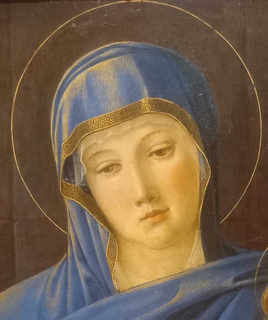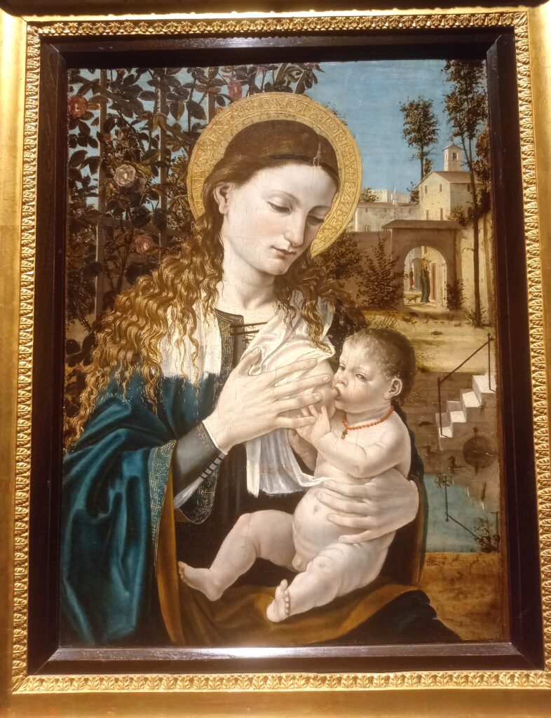 Il viso di Maria è incantevole e bianchissimo. I riccioli ramati, trattenuti da un sottile cordoncino nero, le scendono morbidi lungo le spalle. L’abito è elegantissimo, alla moda; la bordatura di ricami dorati impreziosisce il manto blu petrolio. Da notare il realismo con cui è rappresentato il Bambino, intento a succhiare il latte dal seno materno.