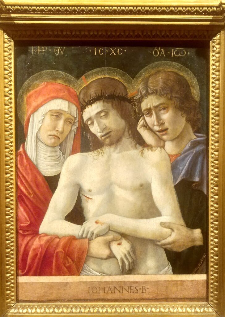 Indiscutibile capolavoro giovanile: Maria e Giovanni sorreggono il corpo morto di Gesù, mostrando le sue ferite e le loro lacrime. Nel fondo scuro si leggono i loro nomi, scritti in greco, e ciò rimanda alla modalità di rappresentazione bizantina – molto viva a Venezia.