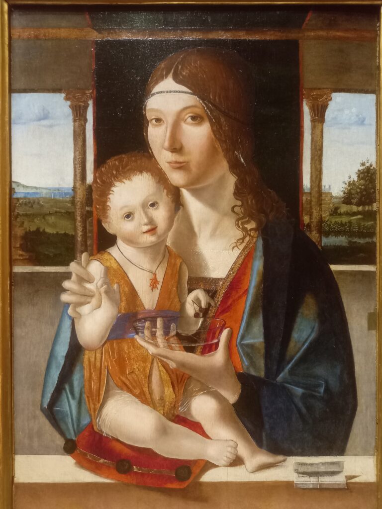 Il Bambino, dall’espressione dolcissima, pesca alcune ciliegie da una ciotola di vetro, che la Madonna tiene nella mano sinistra: un dettaglio simbolo della Passione, di strepitoso realismo. Anche il cuscino purpureo su cui Gesù siede, allude alla Passione, come la collanina di corallo, rosso talismano scaramantico che si donava ai neonati per allontanare da loro il male.