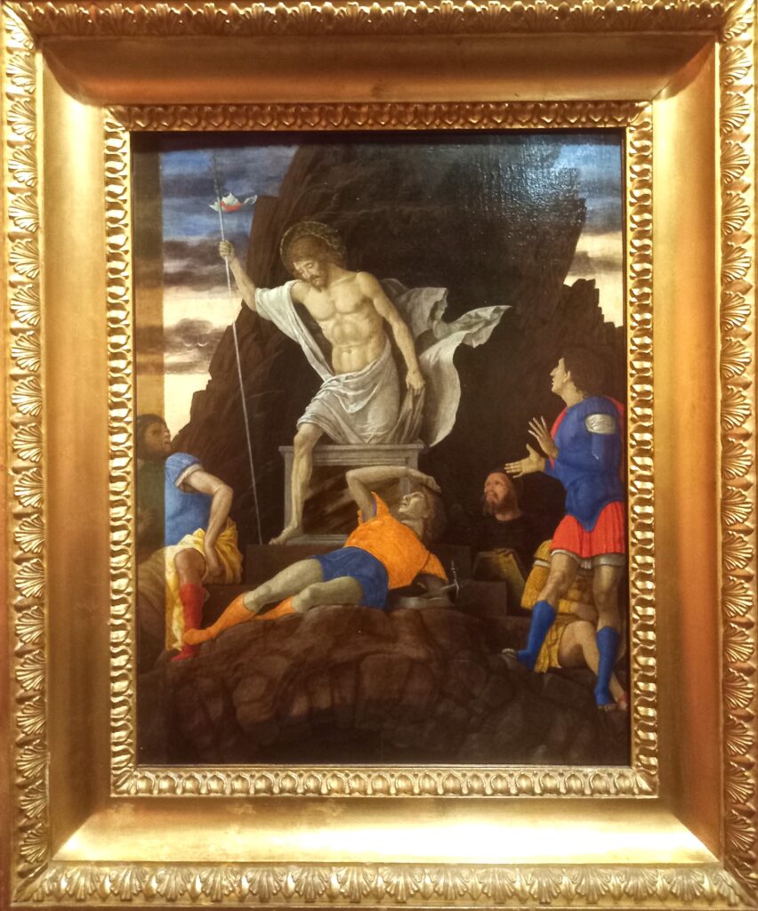 La luce del nuovo giorno colora il cielo all’orizzonte. Recando il vessillo della resurrezione, Gesù balza fuori dal sepolcro, col sudario bianco mosso dal vento del trionfo miracoloso della vita sulla morte. I soldati addormentati si svegliano d’improvviso, meravigliati, forse impauriti.