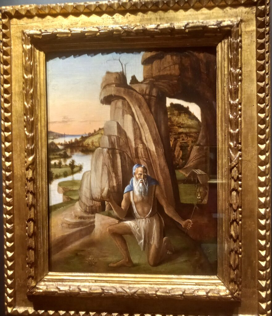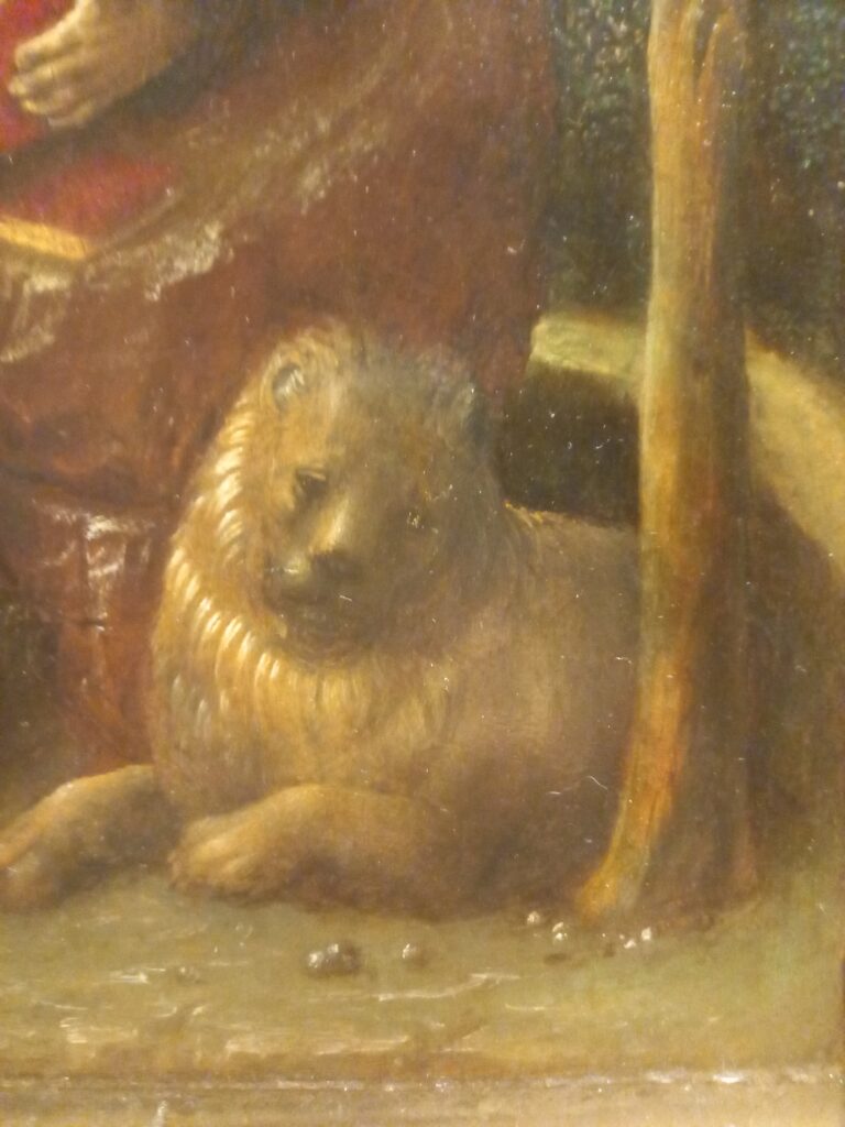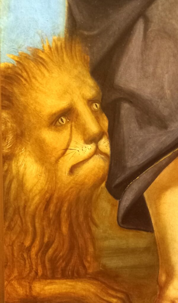 Da quando ho visto il quadro di Colantonio a Capodimonte, coltivo una passione per i dipinti che raffigurano san Gerolamo e il leone. Presto loro sempre un’attenzione particolare: soprattutto per le espressioni umane di questi felini antropizzati. E quest’opera mi sembra particolarmente riuscita.