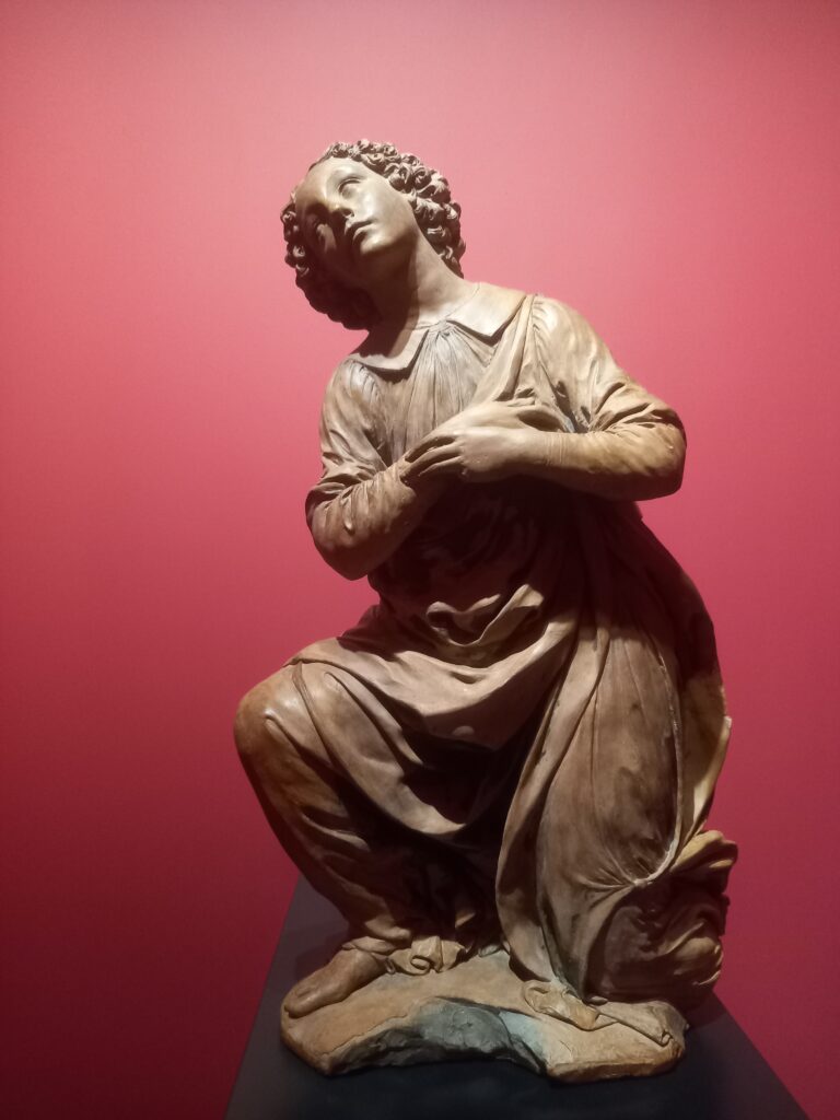 Non ha più le ali, smarrite nel tempo. Ha perso anche i colori che lo rivestivano completamente (resta qualche lacerto, qua e là). Tuttavia è bellissimo. Il modellato è minuzioso: da notare la delicatezza dei riccioli e i bottoncini della veste.