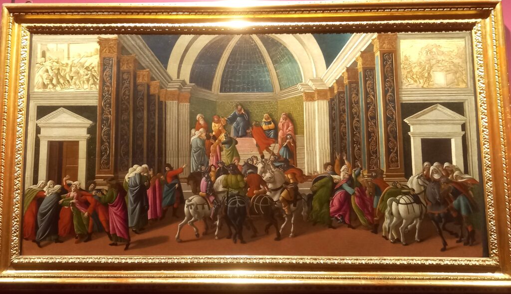 Botticelli vi racconta una vicenda della storia romana – quella di Virginia – narrata da Tito Livio. Una vicenda che celebra l’onore e la castità femminili come virtù da difendere a prezzo della vita.