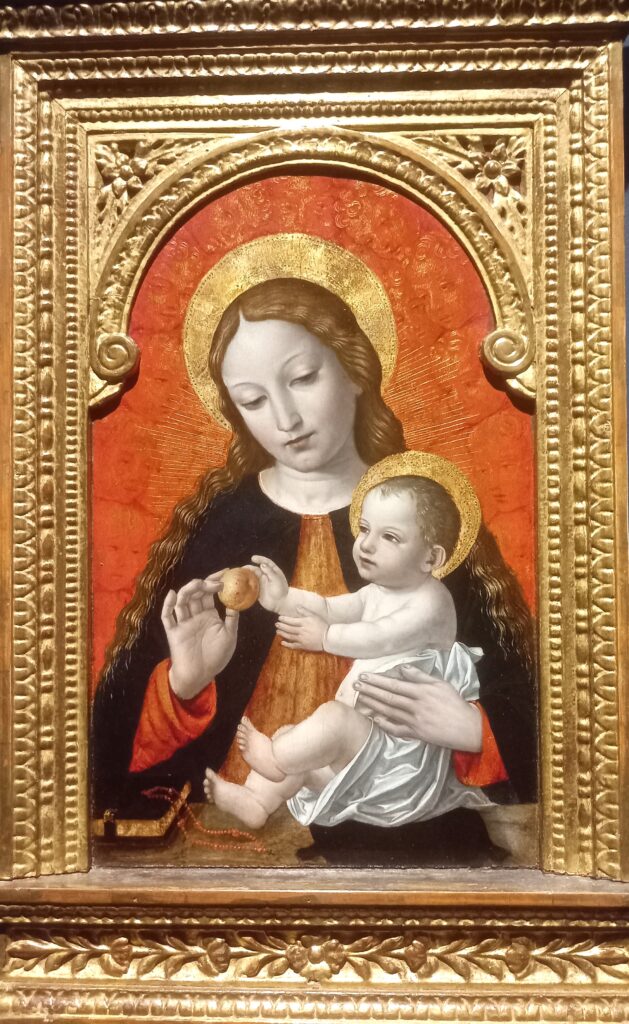 La Madonna ha la bellezza tipica e riconoscibile delle Madonne del Bergognone. Ha lunghi capelli ramati, sciolti sulle spalle, la carnagione d’avorio, un manto scuro, un abito dorato dalle maniche rosse; guarda teneramente Gesù cui porge un frutto (escludo che sia una mela, che alluderebbe troppo esplicitamente al sacrificio di Cristo).