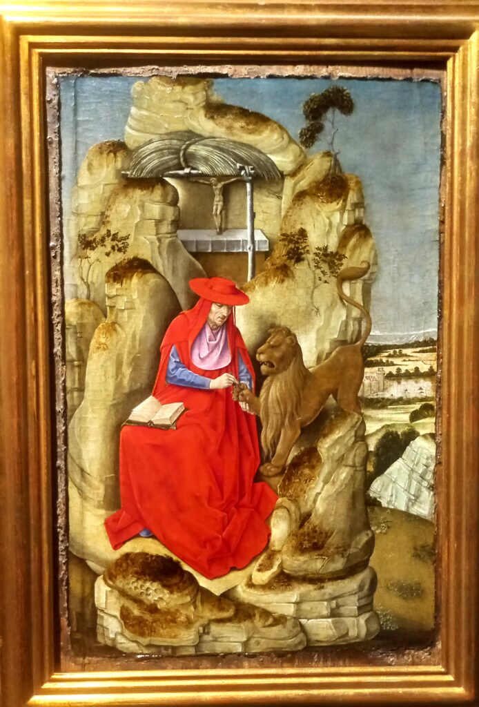 In questo dipinto, copia fedele di un’opera del fiammingo Rogier van der Weiden, in una sorta di ambiente roccioso che sorge entro una terra desolata (solo un’abitazione fortificata – forse un monastero – affaccia su uno specchio d’acqua), Girolamo, la Bibbia sulle ginocchia, toglie la spina dalla zampa del leone, dall’espressione sofferente. Dietro le spalle ha un piccolo altare col crocifisso; contro la pietra arida e nuda, si staglia con energia il rosso dell’abito cardinalizio.