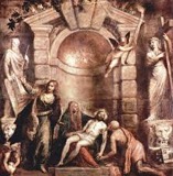 Una donna a sinistra tiene sollevata la testa di Gesù; un’altra, con la testa voltata, gli tiene una mano. In alto, altre due chiudono la scena.