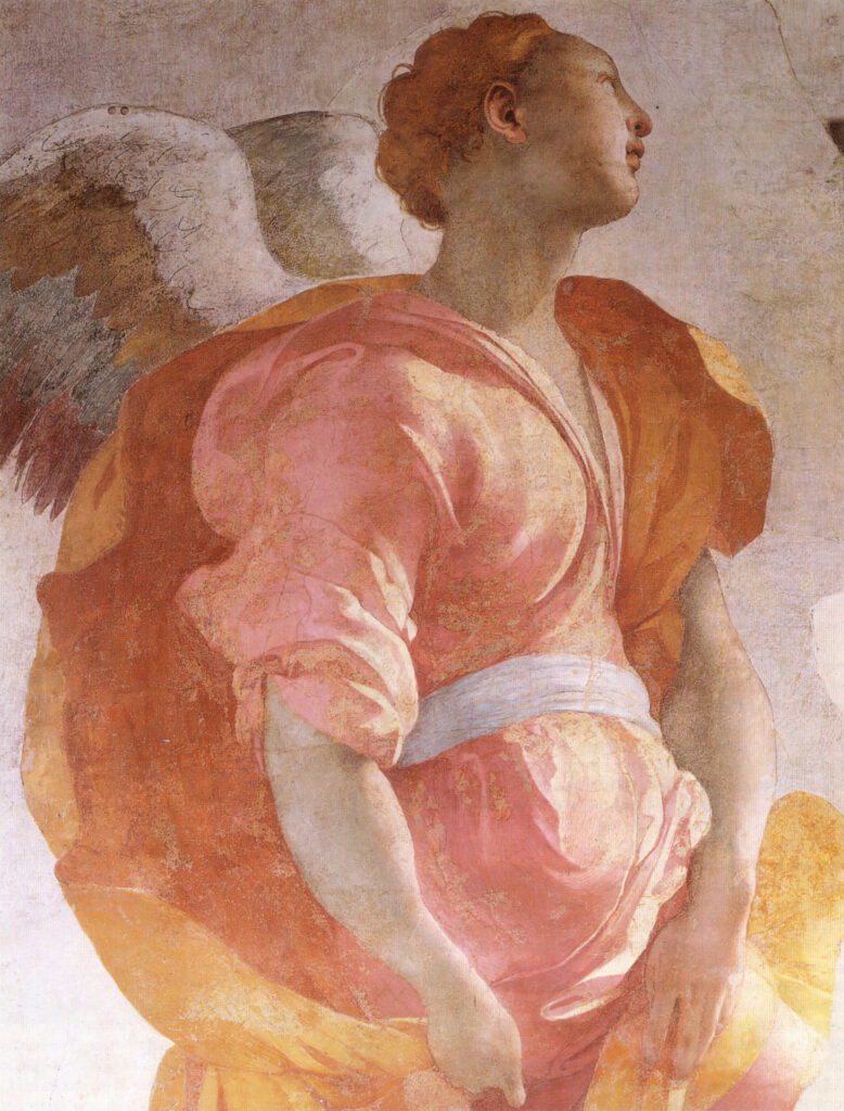 Maria Vergine – dicevo – sta salendo i gradini verso un altare – dove è appoggiato un candelabro – e si sbilancia all’indietro. Anche la veste di lei ha colori caldi, ma il mantello è azzurro e glicine il velo sulla testa. A parte il fatto che i colori di Pontormo non sai mai quali siano, hanno effetti cangianti, cambiano con l’angolazione della luce …