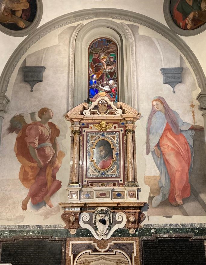 Nella chiesa, a destra, prima cappella. Si chiama la Cappella Capponi. È affrescata interamente dal Pontormo che qui dispiega tutto il suo genio creativo, Gli anni: il 1526 e ’27. Pontormo aveva poco più di trent’anni. E creava già capolavori.