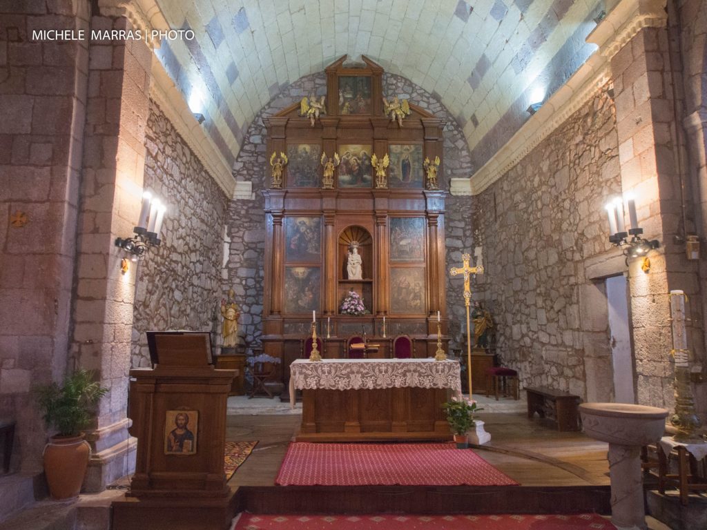 L’interno è coperto da un soffitto ligneo a capriate mentre i transetti sono coperti da volte a crociera in nuda pietra.
