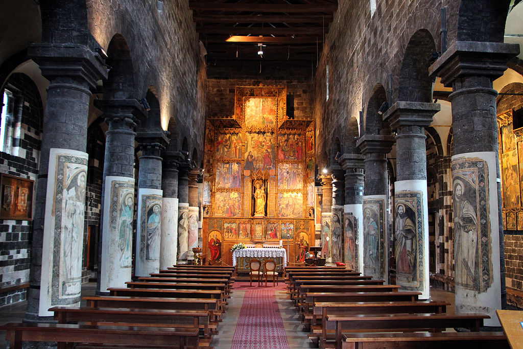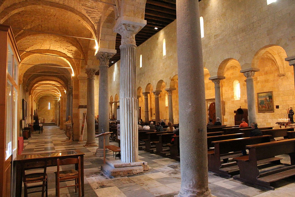 La navata centrale, molto più larga di quelle laterali (con un rapporto di 3:1), è coperta a capriate lignee, che riportano diverse scritte in colore rosso risalenti al XVII secolo. I colonnati, in massima parte composti da materiali di spoglio, inseriscono nella monocromia delle pareti una nota di colore, che varia dal rosa e grigio dei graniti, all’avorio dei marmi. I capitelli sono quasi tutti di epoca romana.