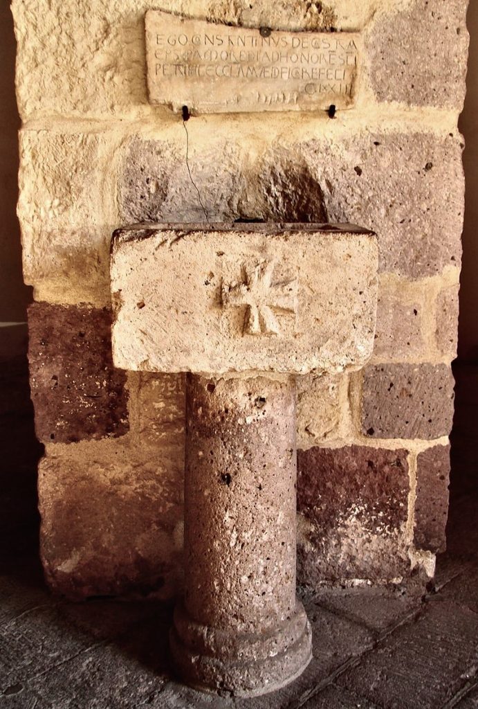 In corrispondenza del primo pilastro a destra, a partire dall’ingresso, si trova il fonte battesimale in calcare bianco con una croce greca per ciascun lato. Sopra vi è, murata, l’epigrafe di dedicazione della chiesa del 1073.