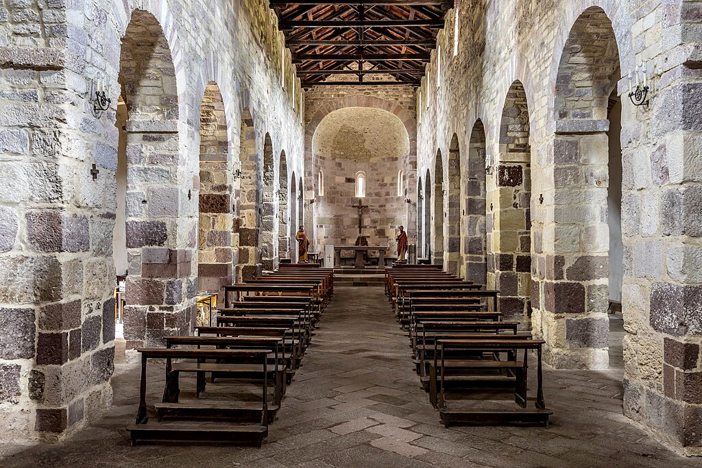 L’interno della basilica è un unico ambiente, alto nella navata centrale, divisa dalle più basse tramite due serie di archi a tutto sesto, retti da ventidue colonne. La pianta, a sviluppo longitudinale, è conclusa, su ambo i lati corti, con due absidi contrapposte, illuminate da monofore.