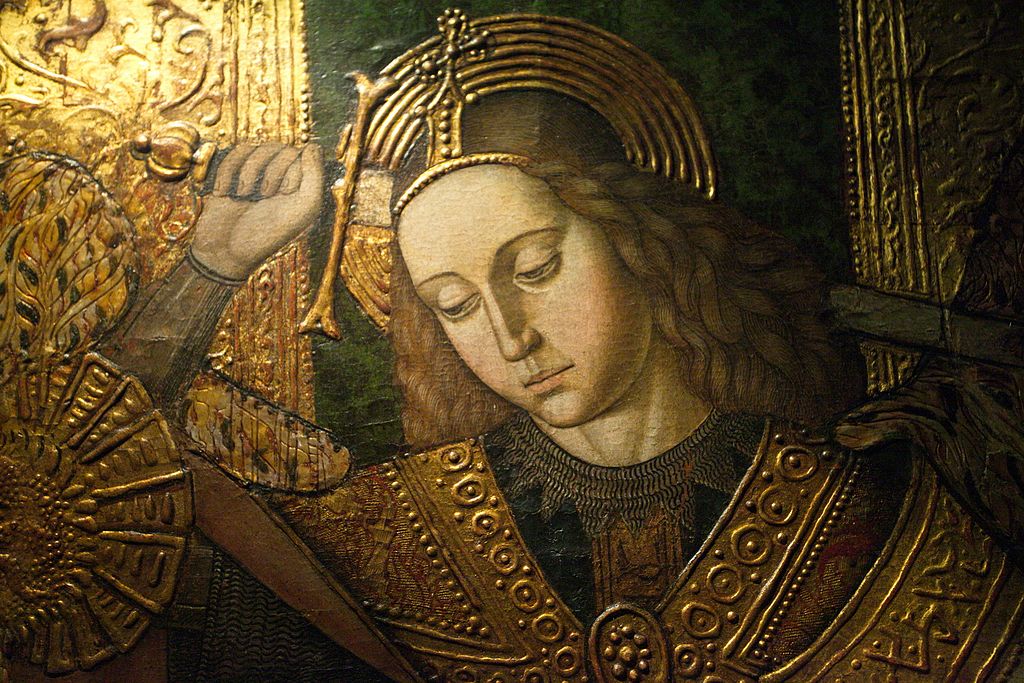 - in basso, santa Scolastica, san Costantino imperatore, sant’Elena, l’arcangelo Gabriele e la Vergine annunziata;