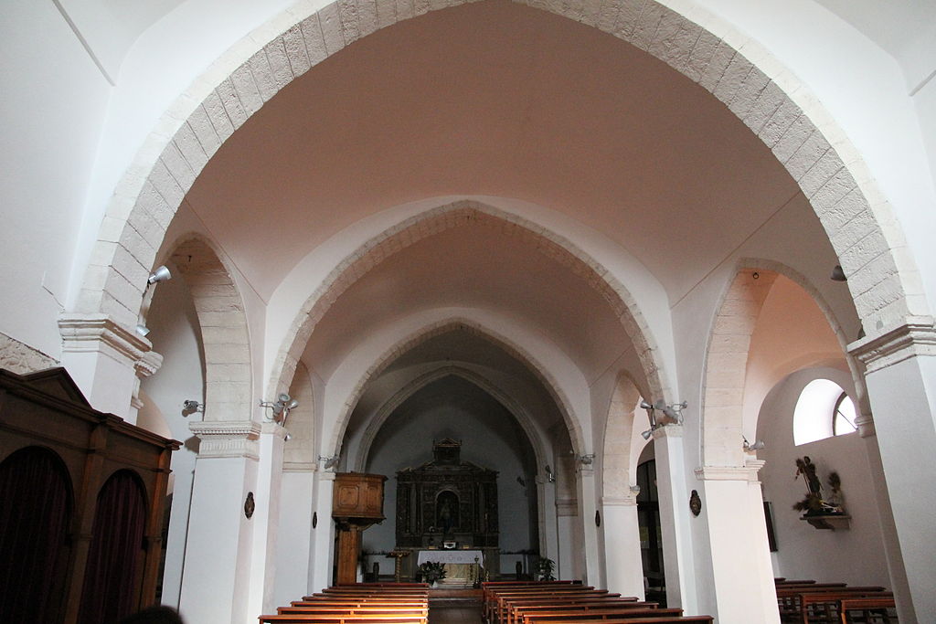 L’interno ha il pavimento più basso, rispetto all’esterno, di 60 cm; è a tre navate, con nove archi a tutto sesto per lato, sorretti da pilastri rettangolari. La navata centrale è coperta da capriate lignee, mentre le navate laterali hanno una volta a crociera.