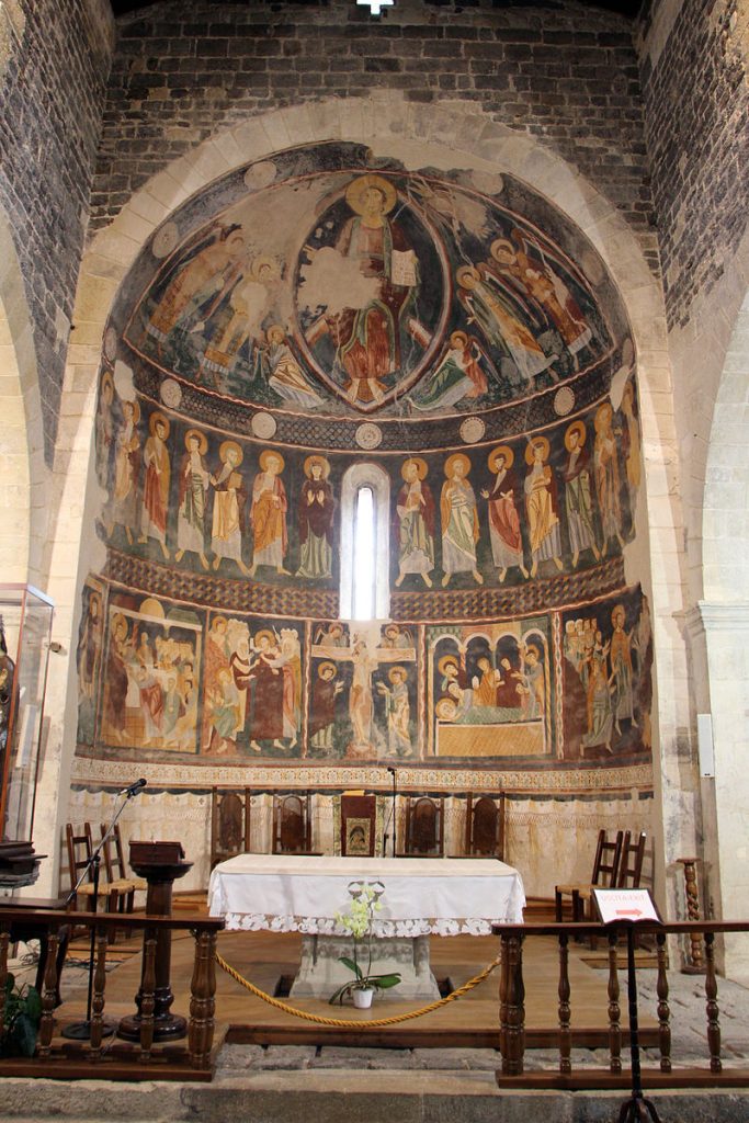 Nell’abside della cappella maggiore è conservato in modo completo un ciclo di affreschi (seconda metà XII sec.). Le pitture occupano il catino con il Cristo in mandorla con serafini, angeli ed arcangeli, mentre il semicilindro absidale è suddiviso in tre fasce: nella prima si allineano la Madonna orante con i santi; quella mediana illustra alcune scene della vita di Cristo (Ultima Cena, Bacio di Giuda, Crocifissione, Sepoltura e Discesa agli Inferi); in quella alla base è rappresentato un finto velario.