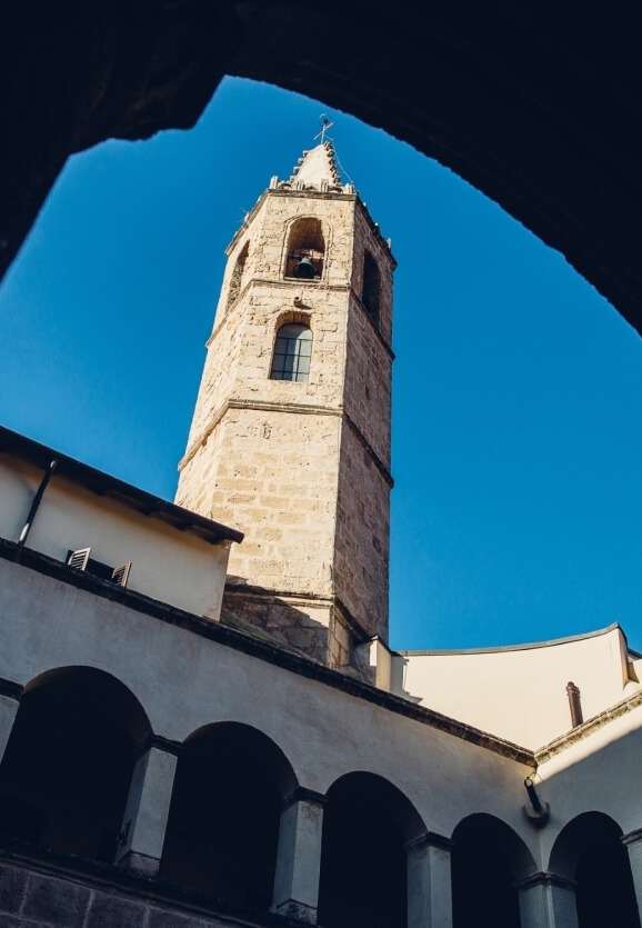 Lo spazio aperto è dominato dall’agile struttura del campanile esagonale in stile gotico-catalano, concluso da guglia dentellata che, con il suo sviluppo verticale, conferisce un certo slancio alla severa architettura del chiostro.