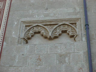 Nella facciata è assente il frontone, ma sono presenti due colonnine. Il secondo ordine è composto da una falsa loggia di quattro colonne, due delle quali a zig zag e da un oculo quadrilobato. Particolarmente suggestivi sono i rilievi calcarei con ruote e motivi geometrici che si trovano fra le arcatelle.