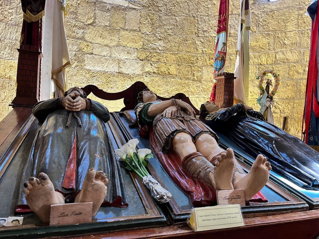 L’abside contrapposta all’altare ospita un catafalco ligneo del XVII secolo con le statue policrome dei santi martiri Gavino, Proto e Gianuario, in posizione giacente.