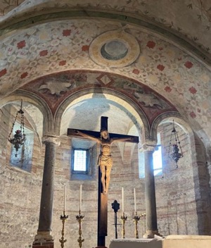 Visitiamo prima la chiesa inferiore, benedettina. Risale all’XI sec., ha tre navate ed è davvero suggestiva. Le volte e gli archi hanno decori semplici, ma poetici. Spesso vi è dipinto il fiore a sei petali, detto anche fiore della vita.