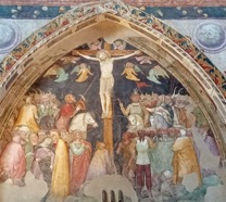 Sopra la porta laterale è affrescata un’altra Crocifissione, opera attribuita alla scuola di Turone di Maxio e risalente al 1363.