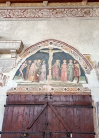 Nella controfacciata è affrescata questa stupenda Crocifissione del metà del ‘300, opera di Turone di Maxio, innovatore della pittura trecentesca a Verona. Notare la drammaticità delle espressioni e la vivezza dei colori. Il personaggio ai piedi della croce assomiglia a Dante, ma non è sicuro che sia proprio lui.