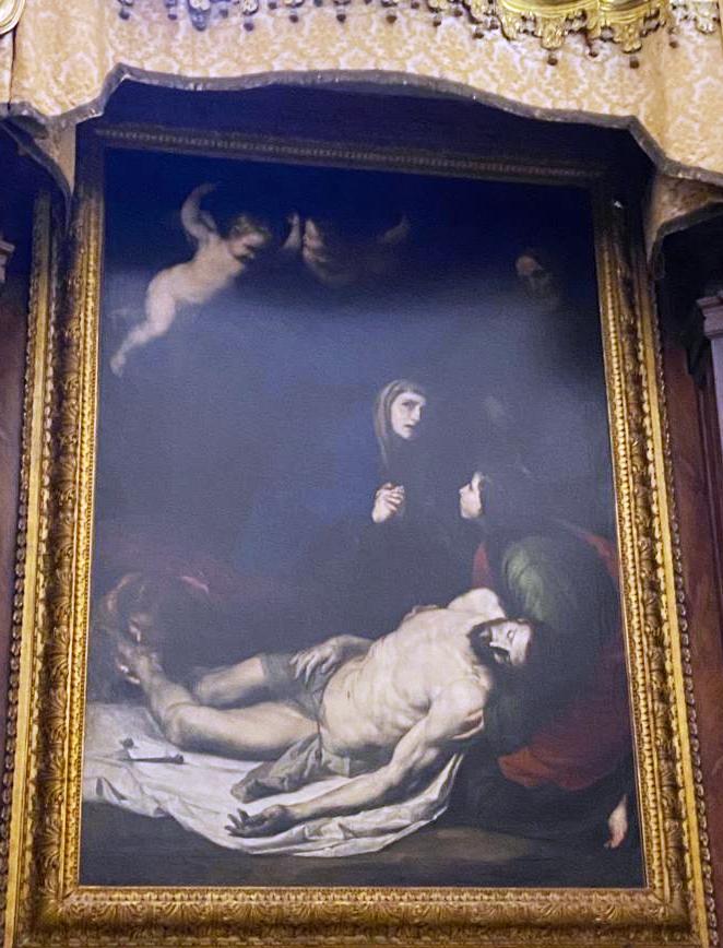 Teoricamente questi luoghi erano inaccessibili. Ho chiesto al custode, che se ne stava stravaccato sugli scanni del coro dei conversi, se mi permetteva di dare un’occhiata a quel magnifico Ribera, di cui intravedevo solo il corpo del Cristo. Devo averlo impietosito. Fatto sta che ha tolto il cordone rosso e ci ha fatto entrare.