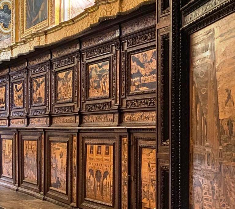 Straordinaria la sacrestia con gli arredi mobiliari intarsiati di fine Cinquecento! Gli intarsi sono di scuola fiamminga: leggo che è una delle opere d’arte più significative e caratteristiche della tarda cultura manierista a Napoli.