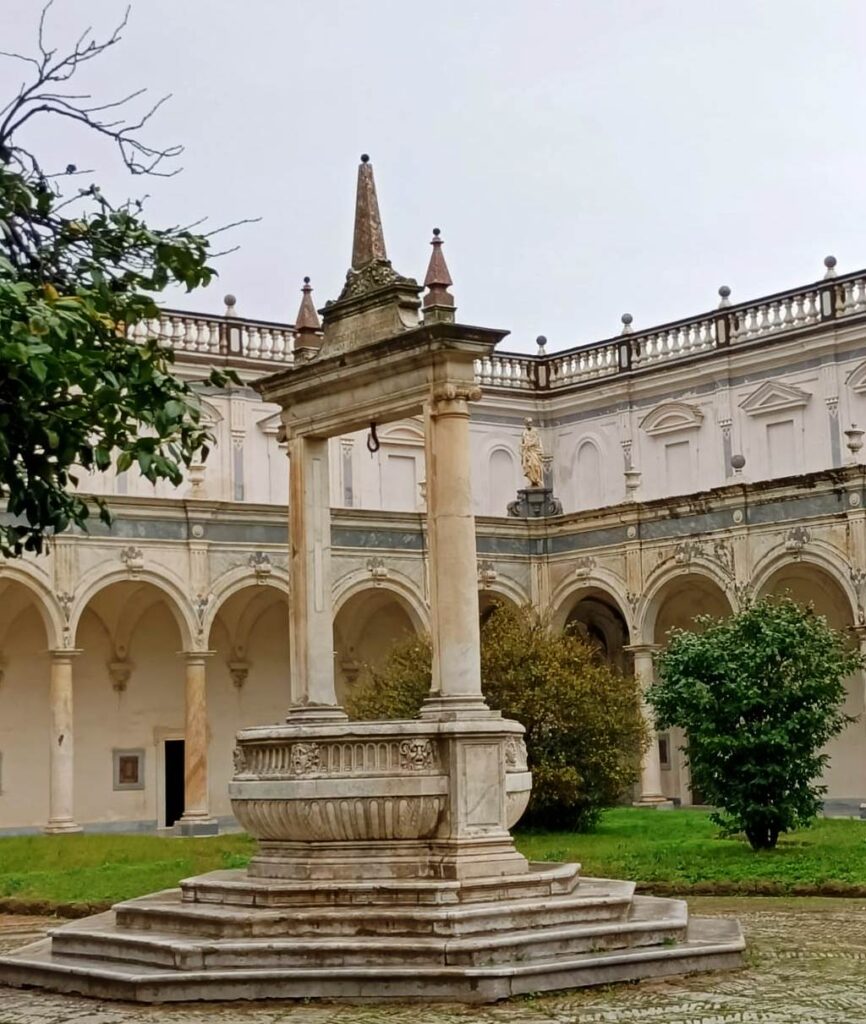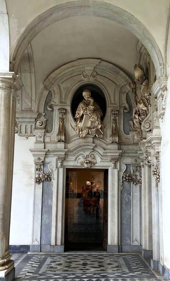 Eccoci, pronte all’arrembaggio, nell’imponente e verdissimo chiostro Grande, circa 5.000 mq, un giardino con due bei pozzi, circondato dal porticato a colonne. Il chiostro fu ampliato nel ‘500 e scenograficamente arricchito nel ‘600 da Cosimo Fanzago (uno degli architetti barocchi più straordinari), che creò negli angoli porte sormontate da sculture; e soprattutto realizzò il piccolo commovente cimiterino, un fazzoletto di terra circondato da una balaustra con sedici teschi marmorei. Qui, senza bara né nome, venivano sotterrati tutti i monaci.
