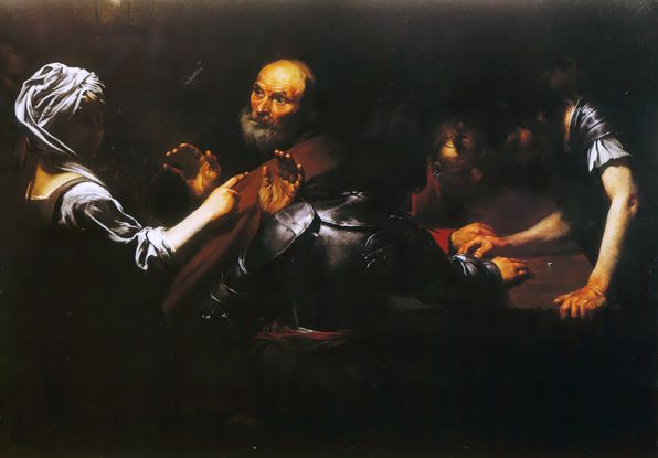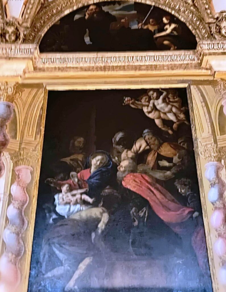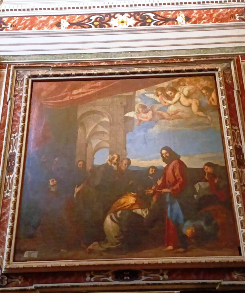 Nel ritorno verso l’abside vedo, nella controfacciata della sacrestia, un quadro che ho studiato: La negazione di S. Pietro, forse di Caravaggio, forse no. La Mina Gregori dice di no, e come posso pensare di non fidarmi? Però il dubbio mi affascina perché, per secoli, il quadro è stato creduto del Maestro più maestro di tutti!