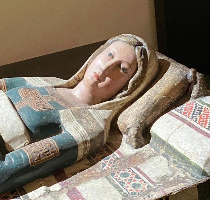 Nella Vergine puerpera (donata da Sancia di Maiorca, regina di Napoli, a inizio del ‘300, al monastero di Santa Chiara), la Madonna è raffigurata distesa, secondo una iconografia di provenienza siriaca, diffusa fin dal VI secolo. Ancora pensosa per il solitario travaglio e assorta nell’arcano mistero, la Vergine aveva, presumibilmente, come in altre iconografie coeve, il Bambino alle sue spalle riscaldato dal bue e dall’asino.
