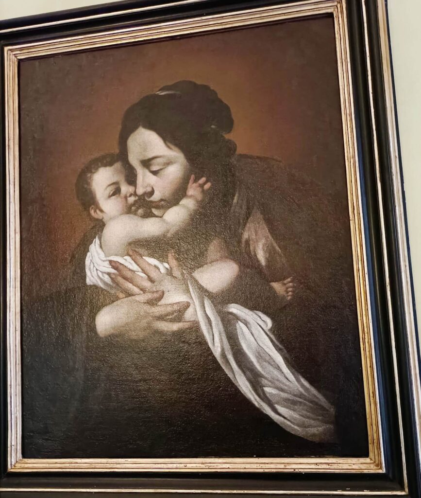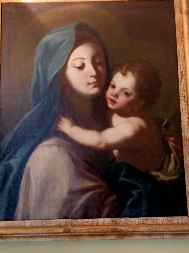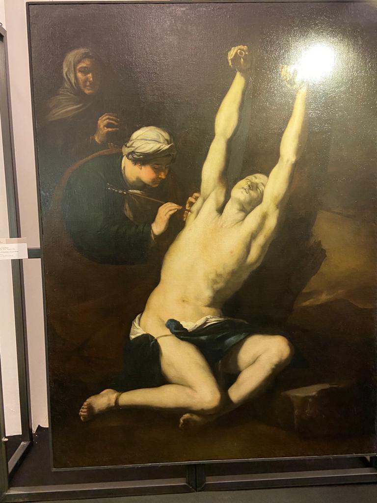 E siamo nella cappella Pontano. Guardo le opere e non ci trovo nessuna logica. Quadri vari di soggetti vari, soprattutto sacri, in genere del ‘600, ma quello che balza agli occhi non è l’immagine della donna – come sembrava suggerire il titolo. Anzi, uno dei quadri più belli è il San Sebastiano curato da Sant’Irene di Luca Giordano – e vi spicca il corpo del santo, non di lei, il cui viso è commovente, sì, ma in ombra. Cosa c’entri con monne e madonne, non so. Io lo inserirei in una mostra dedicata al corpo dell’uomo!