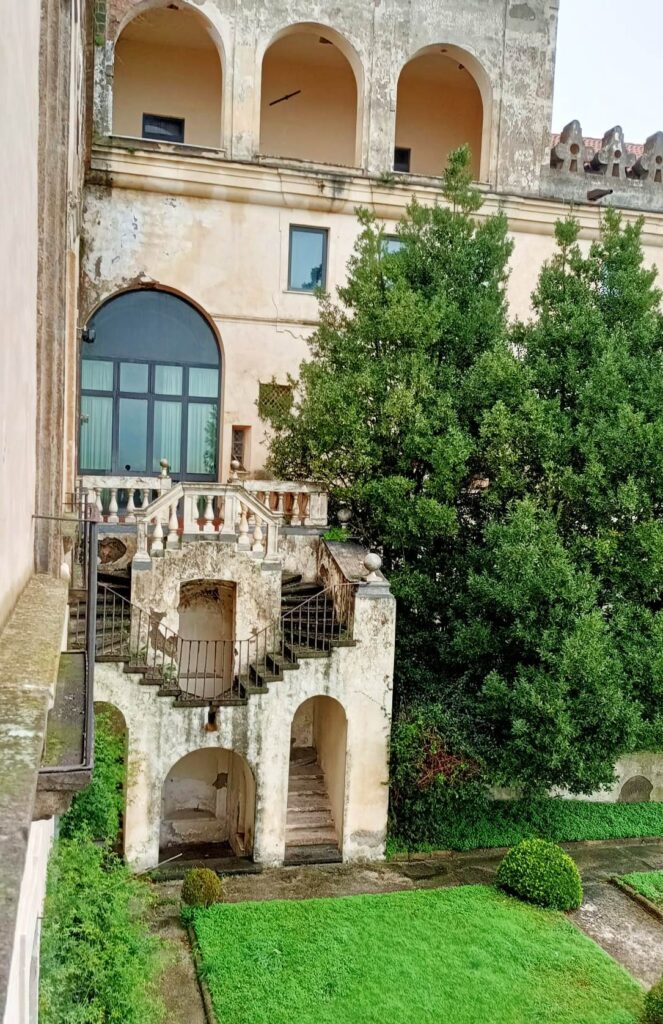 Dalla loggia è visibile la particolare scala esterna a calicò (a doppia rampa) del Fanzago, che unisce il giardino pensile, a strapiombo sulle pendici del colle, al quarto del priore