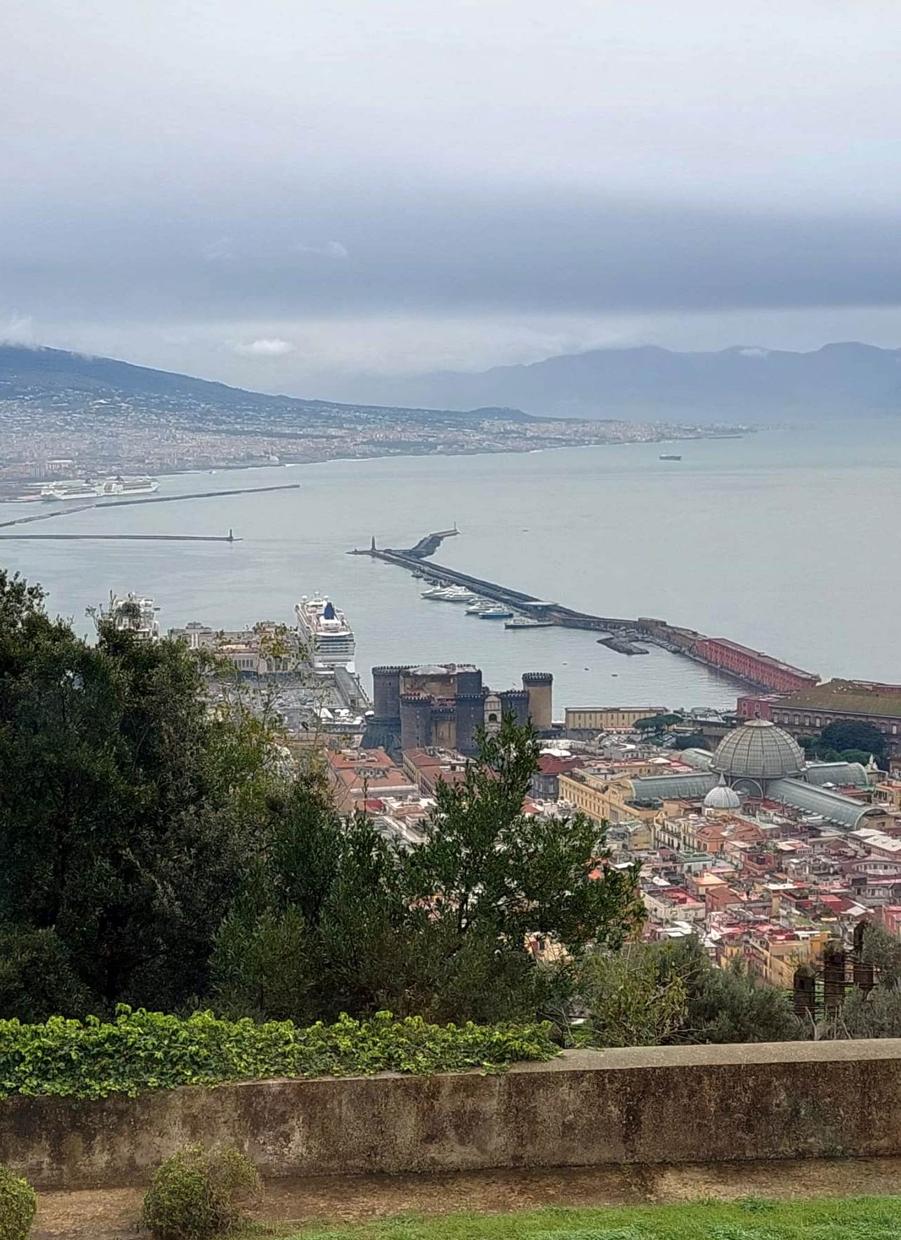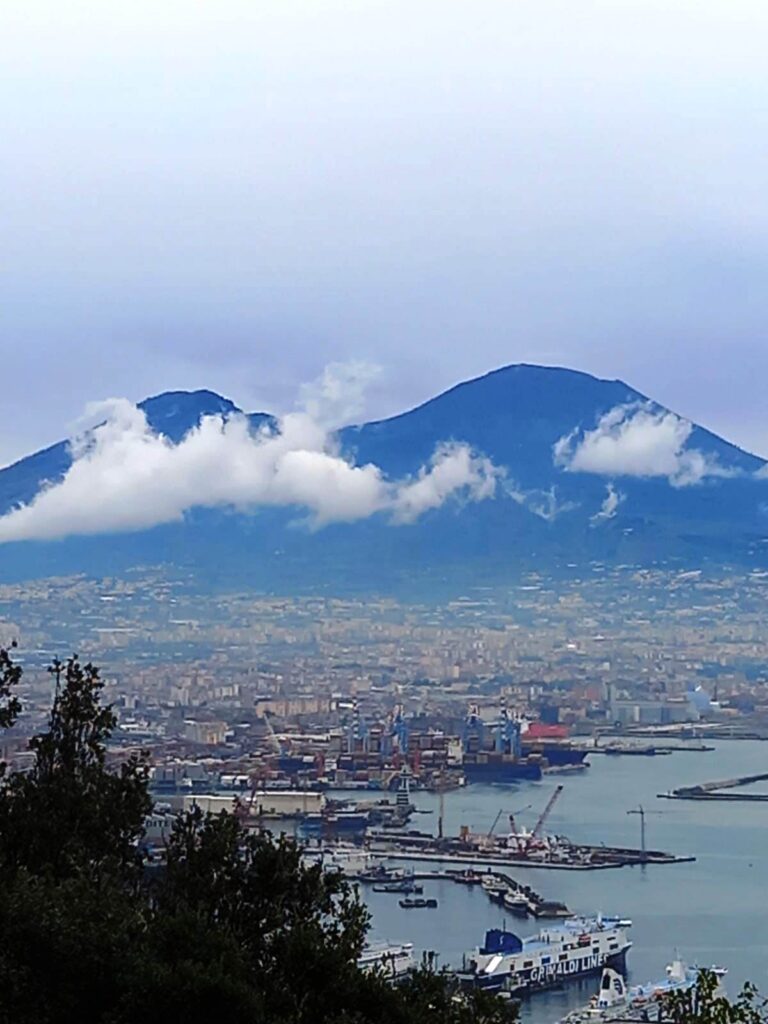 Il Vesuvio è di fronte: nubi pesanti lo velano, in parte lo nascondono.